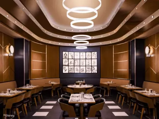 Geniet van een culinaire reis door New York in het Manhattan Restaurant in Disney Hotel New York - The Art of Marvel in Disneyland Parijs. De gigantische geometrische kroonluchter van Asgard is een echte blikvanger en zorgt voor een luxueuze uitstraling.