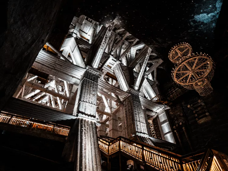 Je ziet samen met een gids de prachtige uit zout gehouwen zalen in de mijnen.