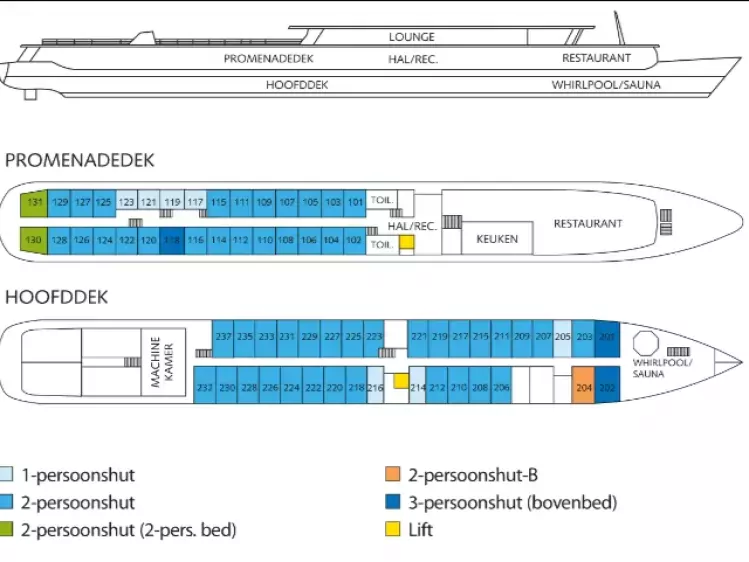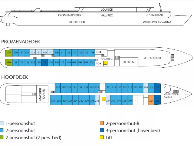 Vaarschema In zeer zeldzame gevallen kan het voorkomen dat er noodzakelijke wijzigingen in het vaarprogramma zijn. Door een cruise bij ons te boeken aanvaard je dit risico. Hoog/laag water Hoog of juist laag water; extreme weersomstandigheden komen steeds vaker voor. Door deze onvoorspelbaarheid is het voor ons voorafgaand aan een reis niet altijd in te schatten of waterstanden het vaarprogramma beïnvloeden. Daarom kan het ook vlak voor of tijdens de cruise voorkomen dat het programma van een reis moet worden aangepast. Dit doen we niet lichtzinnig. Dergelijke afwegingen zijn complex en altijd gebaseerd op een grondige evaluatie van de lokale omstandigheden. Toegewezen aanlegplaatsen Tijdens de reis proberen we zo dicht mogelijk bij het centrum aan te leggen. Dit is echter afhankelijk van de ligplaats die de havenmeester het schip toewijst. In enkele steden of dorpen is het helemaal niet mogelijk om met het schip in of nabij het centrum aan te meren. Wanneer je minder mobiel bent zal je dan gebruik moeten maken van het openbaar vervoer of een taxi om het centrum te bezoeken. Ook kan het voorkomen dat meerdere schepen een ligplaats delen waardoor het uitzicht vanuit je hut belemmerd wordt en dat je het schip mogelijk alleen via een ander schip kunt bereiken en/of verlaten. |