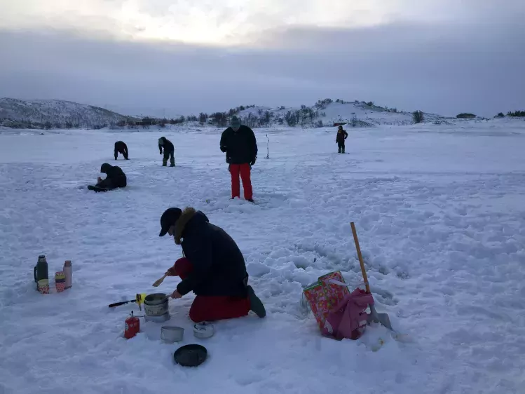 Vandaag wordt het programma 's ochtends omgedraaid; degenen die gisteren de husky safari hebben gedaan, gaan nu een sneeuwschoenwandeling doen en andersom. Het is vandaag wat bewolkter en daardoor kouder, maar dat mag de pret niet drukken! Na vrije tijd voor lunch, heeft iedereen van tevoren een keuze gemaakt wat ze vanmiddag willen doen. Zo gaan een aantal ervaren skiërs gelijk de piste op, terwijl een ander groepje van een skileraar les krijgt vanmiddag. Ik ga zelf mee met de groep die gekozen heeft voor ijsvissen. Een bijzondere ervaring! Na veel geduld wordt er opeens vis na vis gevangen. Onze gids maakt een klein vuurtje en de vers gevangen vis wordt door iedereen geproefd. Ondanks de kou blijven we warm door warme thee en koffie en is het af en toe muisstil op het compleet lege, bevroren meer.