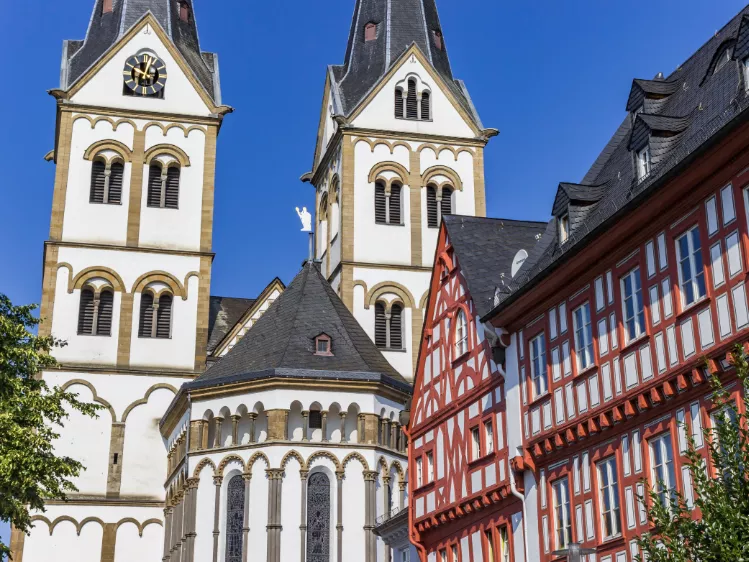 Geniet vanochtend nog van het uitzicht over het prachtige Moezeldal. Eenmaal terug op de Rijn zetten we koers naar Boppard. Bij aankomst aan het begin van de middag zie je de torens van de Sint-Severuskerk al van verre. Deze romaanse kerk uit de 12e eeuw verrast van binnen met kleurrijke fresco’s en een indrukwekkend altaar. De ligging aan de Rijn maakt Boppard bovendien ideaal voor een ontspannen wandeling door de stad.