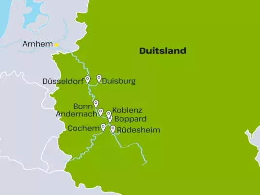 Een combinatie van indrukwekkende steden als Düsseldorf en Keulen, de culturele charme van Bonn en Koblenz en de schitterende wijngebieden rond Boppard en Cochem. Dit is een reis waar cultuur en historie samenkomen. Alles is geregeld: jij hoeft alleen maar te genieten.