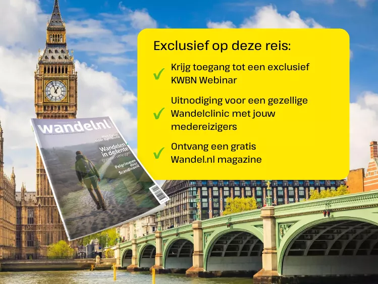 Deze afwisselende reis in samenwerking met Wandel.nl (Koninklijk Wandel Bond Nederland) combineert sfeervolle steden, idyllische landschappen en adembenemende wandelroutes. We beginnen in het bruisende Londen, daarna trekken we het schilderachtige hart van Engeland in: de glooiende Cotswolds. Hier wandelen we langs oude landweggetjes, groene weiden en traditionele pubs die al eeuwen het decor vormen van het Engelse platteland. De reis eindigt in het groen van het graafschap Kent. Boek jij deze reis? Dan krijg je toegang tot een gratis Webinar, verzorgd door een KWBN wandeltrainer. Je ontvangt daarnaast een uitnodiging voor een Wandelclinic waarin je je medereizigers alvast ontmoet. En onderweg naar jouw bestemming krijg je ook nog een gratis Wandel.nl magazine!