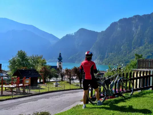50 kmDe bus brengt ons via Bad Ischl en het romantische Weissenbachtal naar de zuidkant van de turqoise Attersee. Vervolgens bereiken we de Mondsee en starten we onze etappe in St. Gilgen aan de Wolfgangsee. We fietsen eerst naar de plaats Mondsee met de bekende Basiliek St. Michael. Hier trouwden Maria en Kapitein von Trapp in de film ‘The Sound of Music’. Vervolgens gaat het langs de Mondsee en Attersee en eindigen we de dag in Seewalchen am Attersee.